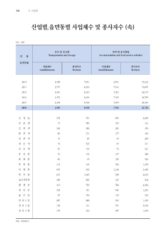 산업별,읍면동별 사업체수 및 종사자수 (속)