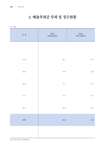 438 ⅩⅢ. 환경 3. 배출부과금 부과 및 징수현황 단위 : 백만원 총부과 총징수 연 별 Total imposition Total collection 2013 84.4 75.6 2014 44.8 44.8 2015 74.4 74.4 2016 47.0 47.0 2017 25.8 25.8 2018 22.3 21.1 자료 : 기후대기과(대기), 수질환경과(수질)