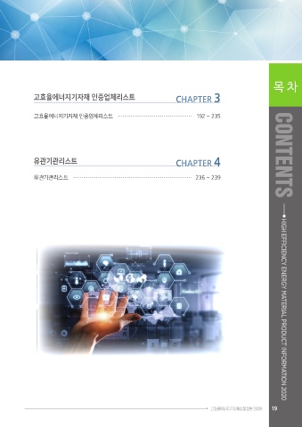 목 차 고효율에너지기자재 인증업체리스트 CHAPTER 3 고효율에너지기자재 인증업체리스트 ……………………………………… 192 ~ 235 유관기관리스트 CHAPTER 4 CONTENTS 유관기관리스트 ……………………………………………………………… 236 ~ 239 고효율에너지기자재상품정보 2020 19 HIGH EFFICIENCY ENERGY MATERIAL PRODUCT INFORMATION 2020