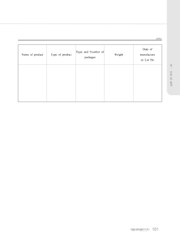 (뒤쪽) Date of Type and Number of Name of product Type of product Weight manufacture packages or Lot No Ⅵ 。 수 입 출 ・ 통 계 식품의약품안전처 101