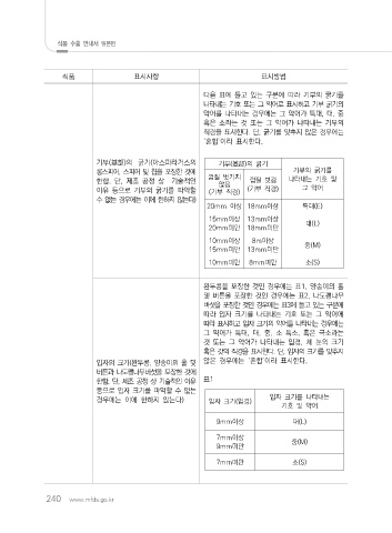것 또는 그 약어가 나타내는 입경, 체 눈의 크기
