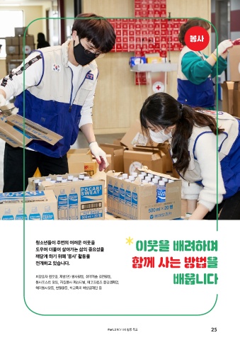 봉사 청소년들이 주변의 어려운 이웃을 이웃을 배려하며 도우며 더불어 살아가는 삶의 중요성을 깨닫게 하기 위해 ‘봉사’ 활동을 전개하고 있습니다. 함께 사는 방법을 희망풍차 멘토링, 제빵(면) 봉사활동, 취약계층 결연활동, 배웁니다 봉사포스트 활동, 자원봉사 페스티벌, 에코프렌즈 환경캠페인, 해외봉사활동, 헌혈활동, 학교폭력 예방캠페인 등 Part.2 RCY 4대 활동 목표 25