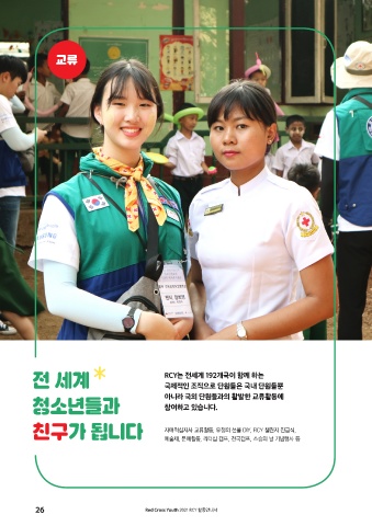 교류 전 세계 RCY는 전세계 192개국이 함께 하는 국제적인 조직으로 단원들은 국내 단원들뿐 청소년들과 아니라 국외 단원들과의 활발한 교류활동에 참여하고 있습니다. 친구가 됩니다 자매적십자사 교류활동, 우정의 선물 DIY, RCY 챌린지 진급식, 예술제, 문예활동, 리더십 캠프, 전국캠프, 스승의 날 기념행사 등 26 Red Cross Youth 2021 RCY 활동안내서