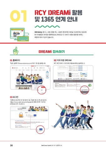 적십자 홈페이지(www.redcross.or.kr) RCY 메뉴를 클릭합니다. 화면 하단의 RCY 지도자용 DREAMi 메뉴를 클릭합니다.