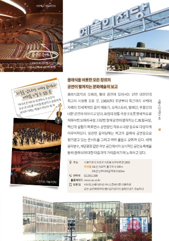 대한민국 클래식 공연의 대중화와 품격 향상을 주도해온, 사진·조형·회화 등 보여주기에는 예술의 전당이 제 격 차례의 전세계적인 음악 예술가, 오케스트라, 발레단, 무용단의 서울시 음악명소 48