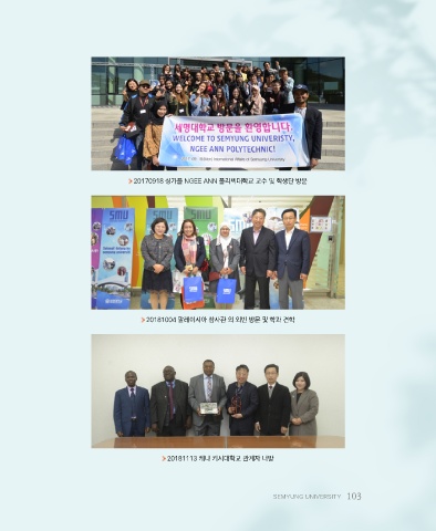 20170918 싱가폴 NGEE ANN 폴리텍대학교 교수 및 학생단 방문 20181004 말레이시아 참사관 외 외빈 방문 및 학과 견학 20181113 케냐 키시대학교 관계자 내방 SEMYUNG UNIVERSITY 103
