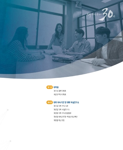 제1장 대학원 제1절 일반대학원 제2절 특수대학원 제2장 대학 부속기관 및 대학 부설연구소 제1절 대학 부속기관 제2절 대학 부설연구소 제3절 대학 부속한방병원 제4절 예비군연대-학생군사교육단 제5절 학교기업