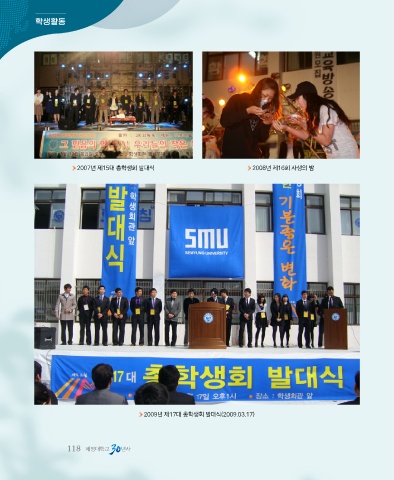 학생활동 2007년 제15대 총학생회 발대식 2008년 제16회 사생의 밤 2009년 제17대 총학생회 발대식(2009.03.17) 118 세명대학교 년사