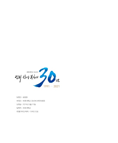 ࣁݺҮ ֙ࢎ 1991 2021 발행인 : 권동현 편집인 : 세명대학교 30년사 편찬위원회 발행일 : 2021년 5월 22일 발행처 : 세명대학교 편집디자인/제작 : 디자인 인포