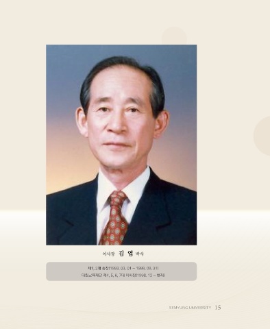 이사장 김 엽 박사 제1, 2대 총장(1993. 03. 01 ~ 1998. 08. 31) 대원교육재단 제4, 5, 6, 7대 이사장(1998. 12 ~ 현재) SEMYUNG UNIVERSITY 15