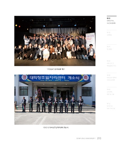 제1편 대학의 역사_ 30년의 발자취 제2편 교육활동 제3편 연구활동 제4편 학생기구 및 학생활동과 지도 170324 민송아트홀 개관 제5편 대외교류·협력과 지역사회 활동 제6편 교육행정, 재정 및 시설 제7편 대학원 및 대학 부속기관 151013 대학창조일자리센터 개소식 SEMYUNG UNIVERSITY 293