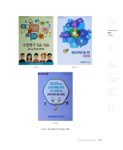 제1편 대학의 역사_ 30년의 발자취 제2편 교육활동 제3편 연구활동 제4편 학생기구 및 2015년 2017년 학생활동과 지도 제5편 대외교류·협력과 지역사회 활동 제6편 교육행정, 재정 및 시설 제7편 대학원 및 대학 부속기관 2019년 [그림 2-18] 교수법 가이드북 발간 현황 SEMYUNG UNIVERSITY 369