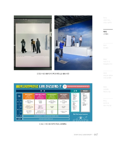 제1편 대학의 역사_ 30년의 발자취 제2편 교육활동 제3편 연구활동 제4편 학생기구 및 학생활동과 지도 [그림2-58] 패션디자인학과 현장실습 활동 사진 제5편 대외교류·협력과 지역사회 활동 제6편 교육행정, 재정 및 시설 제7편 대학원 및 대학 부속기관 [그림 2-59] 실내디자인학과 교육체계도 SEMYUNG UNIVERSITY 447