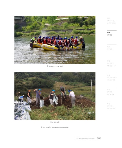 제1편 대학의 역사_ 30년의 발자취 제2편 교육활동 제3편 연구활동 제4편 학생기구 및 학생 MT - 래프팅 장면 학생활동과 지도 제5편 대외교류·협력과 지역사회 활동 제6편 교육행정, 재정 및 시설 제7편 대학원 및 대학 부속기관 학생 봉사활동 [그림 2-92] 컴퓨터학부의 다양한 활동 SEMYUNG UNIVERSITY 509