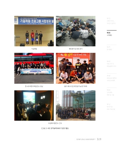 제1편 대학의 역사_ 30년의 발자취 제2편 교육활동 제3편 기업체험 태양광기능대회 준비 연구활동 제4편 학생기구 및 학생활동과 지도 제5편 대외교류·협력과 지역사회 활동 한국수력원자력발전소 방문 솔라 페스티벌 태양광기능경기대회 제6편 교육행정, 재정 및 시설 제7편 대학원 및 대학 부속기관 보령화력발전소 견학 [그림 2-93] 전기공학과의 다양한 활동 SEMYUNG UNIVERSITY 519
