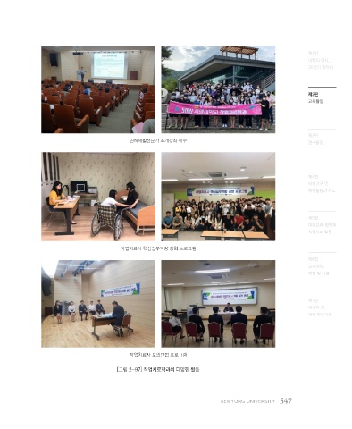 제1편 대학의 역사_ 30년의 발자취 제2편 교육활동 제3편 연하재활전문가 소개강좌 이수 연구활동 제4편 학생기구 및 학생활동과 지도 제5편 대외교류·협력과 지역사회 활동 작업치료사 핵심실무역량 강화 프로그램 제6편 교육행정, 재정 및 시설 제7편 대학원 및 대학 부속기관 작업치료사 모의면접 프로그램 [그림 2-97] 작업치료학과의 다양한 활동 SEMYUNG UNIVERSITY 547