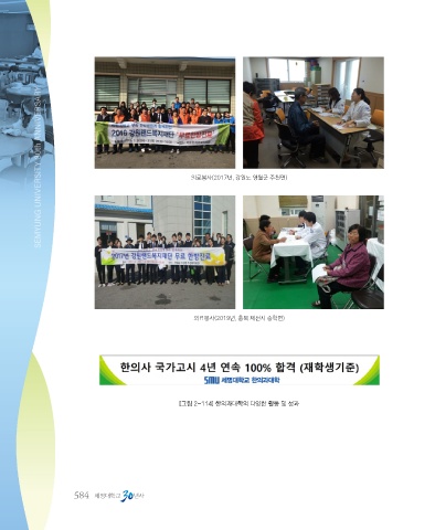 SEMYUNG UNIVERSITY 30th ANNIVERSARY 의료봉사(2017년, 강원도 영월군 주천면) 의료봉사(2019년, 충북 제천시 송학면) [그림 2-114] 한의과대학의 다양한 활동 및 성과 584 세명대학교 년사