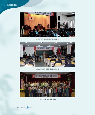 입학과 졸업 1997년 제1기 고위관리자과정수료식 1998년 제3기 고위관리자과정 입학식 2005년 제1회 유학생 입학식 66 세명대학교 년사