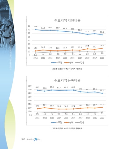 SEMYUNG UNIVERSITY 30th ANNIVERSARY [그림 4-2] 최근 10년간 주요지역 지원 비율 [그림 4-3] 최근 10년간 주요지역 등록 비율 802 세명대학교 년사