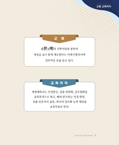 교명·교육목적 교 명 爲世光明의 건학이념을 통하여 세상을 보다 밝게 계도한다는 미래지향적이며 진취적인 뜻을 담고 있다. 교 육 목 적 세명대학교는 인성중심, 실용·전문화, 글로벌화를 교육목적으로 하고, 배려·봉사하는 인성 함양, 실용·전문지식 습득, 외국어·정보화 능력 배양을 교육목표로 한다. SEMYUNG UNIVERSITY 9