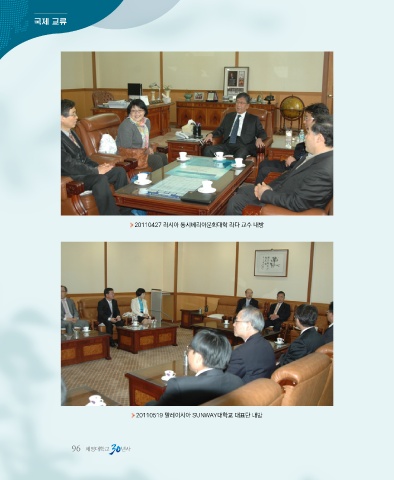 국제 교류 20110427 러시아 동시베리아문화대학 라다 교수 내방 20110519 말레이시아 SUNWAY대학교 대표단 내방 96 세명대학교 년사