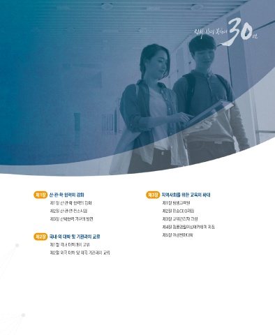 제1장 산·관·학 협력의 강화 제3장 지역사회를 위한 교육의 확대 제1절 산·관·학 협력의 강화 제1절 평생교육원 제2절 산·관·연 컨소시엄 제2절 민송CEO과정 제3절 산학협력 기구의 발전 제3절 고위관리자 과정 제4절 청풍명월여성아카데미 과정 제2장 국내·외 대학 및 기관과의 교류 제5절 여성친화대학 제1절 국내 대학과의 교류 제2절 외국 대학 및 외국 기관과의 교류