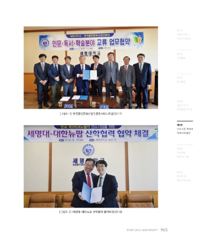제1편 대학의 역사_ 30년의 발자취 제2편 교육활동 제3편 연구활동 제4편 학생기구 및 학생활동과 지도 [그림5-1] 한국출판문화산업진흥원 MOU체결(2017) 제5편 대외교류·협력과 지역사회 활동 제6편 교육행정, 재정 및 시설 제7편 대학원 및 대학 부속기관 [그림5-2] 세명대-대한뉴팜 산학협력 협약체결(2018) SEMYUNG UNIVERSITY 965