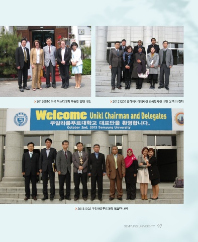 20120510 미국 우스터대학 부총장 일행 내방 20121205 말레이시아대사관 교육참사관 내방 및 학과 견학 20131002 쿠알라룸푸르대학 대표단 내방 SEMYUNG UNIVERSITY 97