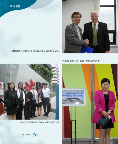 국제 교류 20130401 미국 캘리포니아 폴리텍크닉대학교 학장 내방 및 MOU 140502 말레이시아 쿠알라룸푸르대학 관계자 내방 20110519 말레이시아 SUNWAY대학교 대표단 내방 98 세명대학교 년사