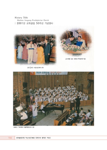 History 70th Gimhae Jungang Presbyterian Church : 2001년 교회설립 50주년 기념행사 감사패를 받는 박유생 목사(2001년) 장기근속자 시상식(2001.10) 50주년 기념예배 특별찬양(2001.10) 102 김해중앙교회 70년사(은혜와 축복으로 달려온 70년)