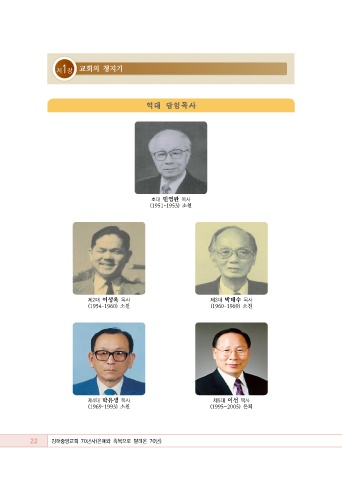 제1장 교회의 청지기 역대 담임목사 초대 민영완 목사 (1951-1953) 소천 제2대 이성옥 목사 제3대 박태수 목사 (1954-1960) 소천 (1960-1969) 소천 제4대 박유생 목사 제5대 이선 목사 (1969-1993) 소천 (1995~2005) 은퇴 22 김해중앙교회 70년사(은혜와 축복으로 달려온 70년)