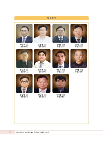 협동장로 박문수 장로 윤광섭 장로 김제형 장로 김종표 장로 장립(2005) 장립(2004) 장립(2004) 장립(2002) 임선균 장로 김태원 장로 반은식 장로 김영겸 장로 장립(2011) 장립(2008) 장립(2005) 장립(2011) 김성인 장로 양보경 장로 이기봉 장로 장립(2010) 장립(2010) 장립(2010) 30 김해중앙교회 70년사(은혜와 축복으로 달려온 70년)