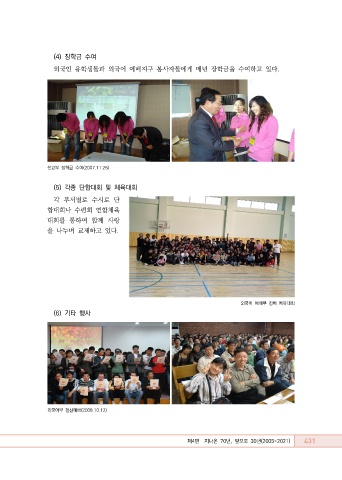 (4) 장학금 수여 외국인 유학생들과 외국어 예배지구 봉사자들에게 매년 장학금을 수여하고 있다. 선교부 장학금 수여(2007.11.25) (5) 각종 단합대회 및 체육대회 각 부서별로 수시로 단 합대회나 수련회 연합체육 대회를 통하여 함께 사랑 을 나누며 교제하고 있다. 외국어 예배부 전체 체육대회 (6) 기타 행사 외국어부 헌신예배(2008.10.12) 431 제4편 지나온 70년, 앞으로 30년(2005-2021)