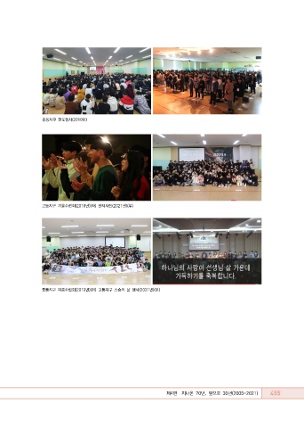 중등지구 전도행사(2019년) 고등지구 겨울수련회(2018년)(좌) 단체사진(2021년)(우) 중등지구 여름수련회(2019년)(좌) 고등지구 스승의 날 행사(2021년)(우) 455 제4편 지나온 70년, 앞으로 30년(2005-2021)