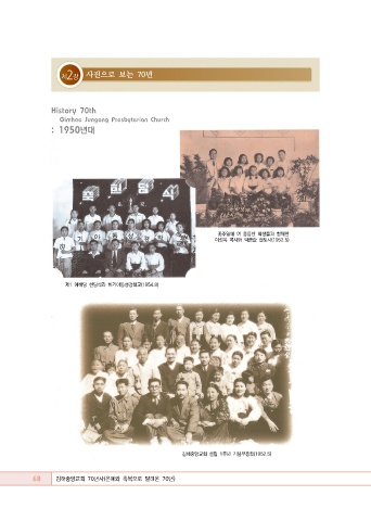 제2장 사진으로 보는 70년 History 70th Gimhae Jungang Presbyterian Church : 1950년대 꽃주일에 여 중등반 학생들과 함께한 이성옥 목사와 박금란 전도사(1952.5) 제1 예배당 헌당식과 하기아동성경학교(1954.8) 김해중앙교회 설립 1주년 기념부흥회(1952.5) 68 김해중앙교회 70년사(은혜와 축복으로 달려온 70년)