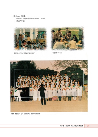 History 70th Gimhae Jungang Presbyterian Church : 1980년대 어린이들로 가득찬 여름성경학교(1981년) 야외예배(1981.5) 부활절 연합찬양대 김해 동광초등학교 교정에서(1982년) 79 제1편 사진으로 보는 70년의 발자취