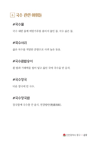 6 국수 관련 어휘들 #국수물 국수 내린 물에 메밀가루를 풀어서 끓인 물. 국수 삶은 물. #국수사리 삶은 국수를 적당한 분량으로 사려 놓은 묶음. #국수원밥숭이 흰 밥과 가래떡을 썰어 넣고 끓인 국에 국수를 만 음식. #국수장국 더운 장국에 만 국수. #국수장국밥 장국밥에 국수를 만 음식. 면장탕반(麪醬湯飯). 68 ● 누들의 본산, 중구 누들 이야기 인천광역시 중구 ● 69