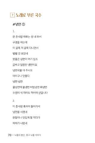 7 노래로 부른 국수 #냉면 ① 1. 한 촌사람 하루는 성 내 와서 구경을 하는데 이 골목 저 골목 다니면서 별별 것 보았네 맛좋은 냉면이 여기 있소 값싸고 달콤한 냉면이요 냉면국물 더 주시오 아이구나 맛좋다. 냉면 냉면 물냉면에 불냉면 비빔냉면 회냉면 수염이 석 자라도 먹어야 산답니다 2. 이 촌사람 혹하여 들어가서 냉면을 시켰네 한참이나 맛있게 잘 먹다가 재채기 나왔네 70 ● 누들의 본산, 중구 누들 이야기