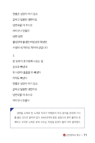 냉면을 소재로 한 노래로 작곡가 박태준이 미국 음악을 편곡해 가사