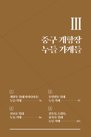 Ⅲ 중구 개항장 누들 가게들 1 3 개항동 일대(차이나타운) 동인천동 일대 누들 가게 ································ 76 누들 가게 ································ 97 2 4 신포동 일대 신흥동, 도원동, 누들 가게 ································ 86 율목동 일대 누들 가게 ······························ 105