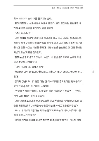 18 물싸움을 보다 못한 엄마가 내 어깨를 붙들었다. 엄마는 더는 소란을 일 황예은은 아무 말 없이 나를 보며 고개를 끄덕였다. 가 봐도 좋다는 말 같 19