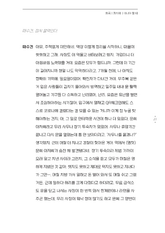거든. 지난달에 방역한다고 다들 모였을 때 들어보니까, 아버지 문씨 아저씨가 숨진 채 발견됐다네. 장기 투숙이라 제법 가까이