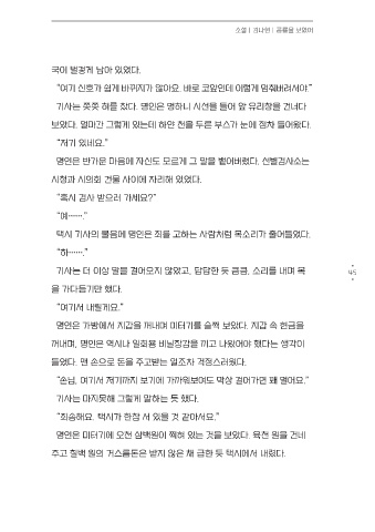 “저기서부터는 길이 한참 막힐 거예요. 그것 때문에 택시를 안 타시는 분 택시 기사의 물음에 명인은 죄를 고하는 사람처럼 목소리가 줄어들었다.