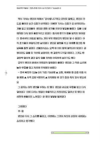 택시 기사는 명인의 뒤에서 ‘감사합니다’하고 외치듯 말했고, 명인이 인 하지만 이번에 그 소리는 심장 소리가 아니었다.