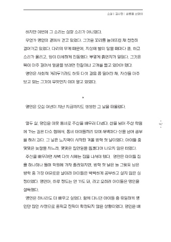 것을 알고 있었을까. 명인은 괜한 생각을 지우며 발길을 돌렸다. 집을 나설 걸어가고 있었다. 다리의 무게 때문에, 지상에 발이 닿을 때마다 쿵, 하고