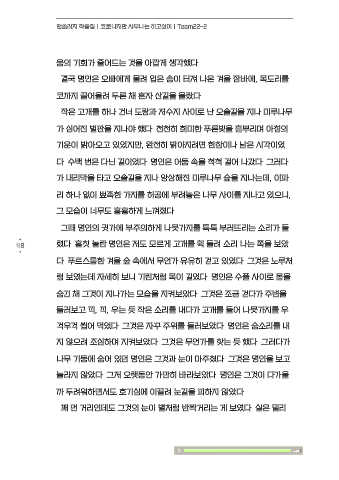 그때 명인의 귓가에 부주의하게 나뭇가지를 툭툭 부러뜨리는 소리가 들 나무 숲을 건너는 일이 무서운 게 아니었다. 명인을 무섭게 하는 일들은 다