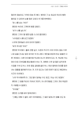 그때 명인의 귓가에 부주의하게 나뭇가지를 툭툭 부러뜨리는 소리가 들 나무 숲을 건너는 일이 무서운 게 아니었다. 명인을 무섭게 하는 일들은 다