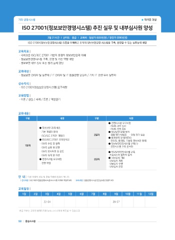 ISO 27001(정보보안경영시스템) 표준을 이해하고 조직의 정보보안경영 시스템을 구축, 운영할 수 있는 실무능력 배양