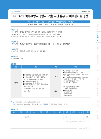 | 선수과정 | ISO 9001(품질경영시스템) 요구사항 이해와 적용(P.66) | 후속과정 | 부패방지경영시스템 인증심사원 양성(P.54) 경영일반