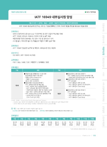 | 선수과정 | IATF 16949 요구사항 이해와 적용(P.123) | 후속과정 | 자동차부품제조업 고객요구사항(CSR) 이해 및 적용(P.122)